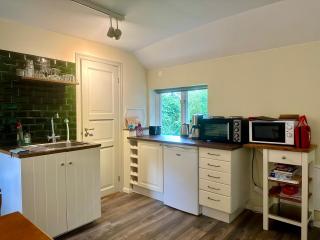 Diese Ferienwohnung mit einer Terrasse und Gartenblick bietet 1 Schlafzimmer, ein Wohnzimmer, einen Flachbild-TV, eine gut ausgestattete Küchenzeile mit einem Kühlschrank und einem Ofen sowie 1 Badezimmer mit einer Dusche. In dieser Ferienwohnung werden Handtücher und Bettwäsche angeboten.