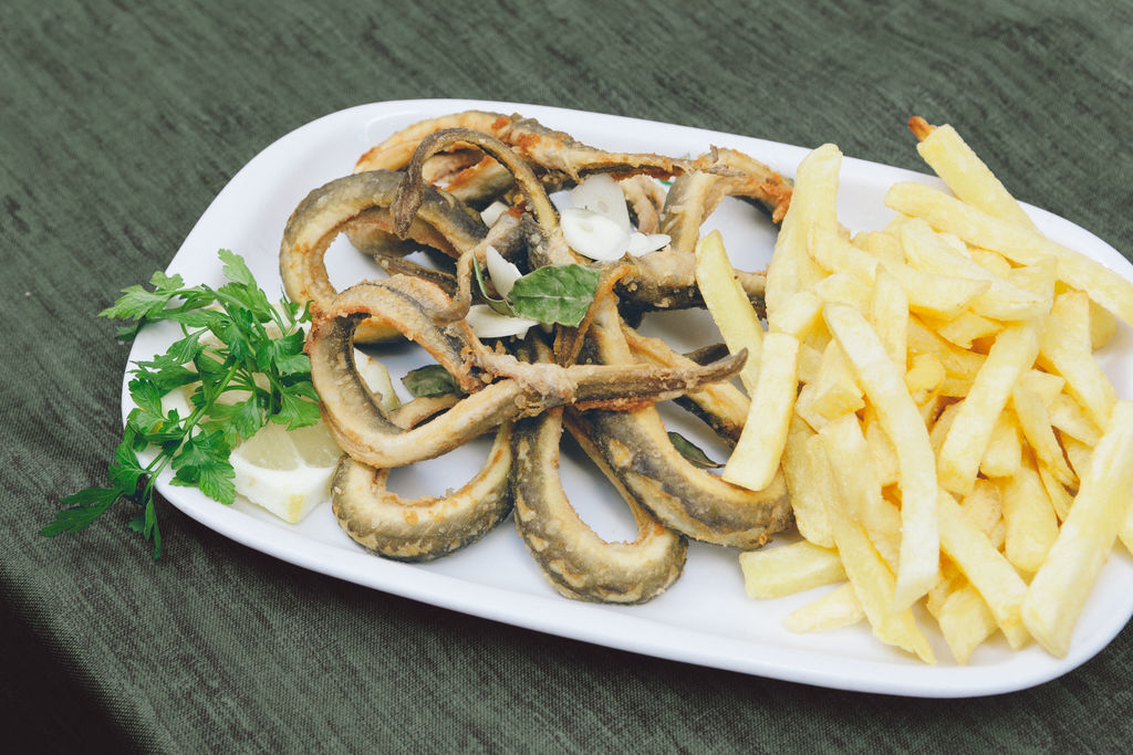 Das Fischrestaurant verfügt über einen Außenbereich, eine separate Bar und einen Speisesaal mit einsehbarer Küche und Auslage.